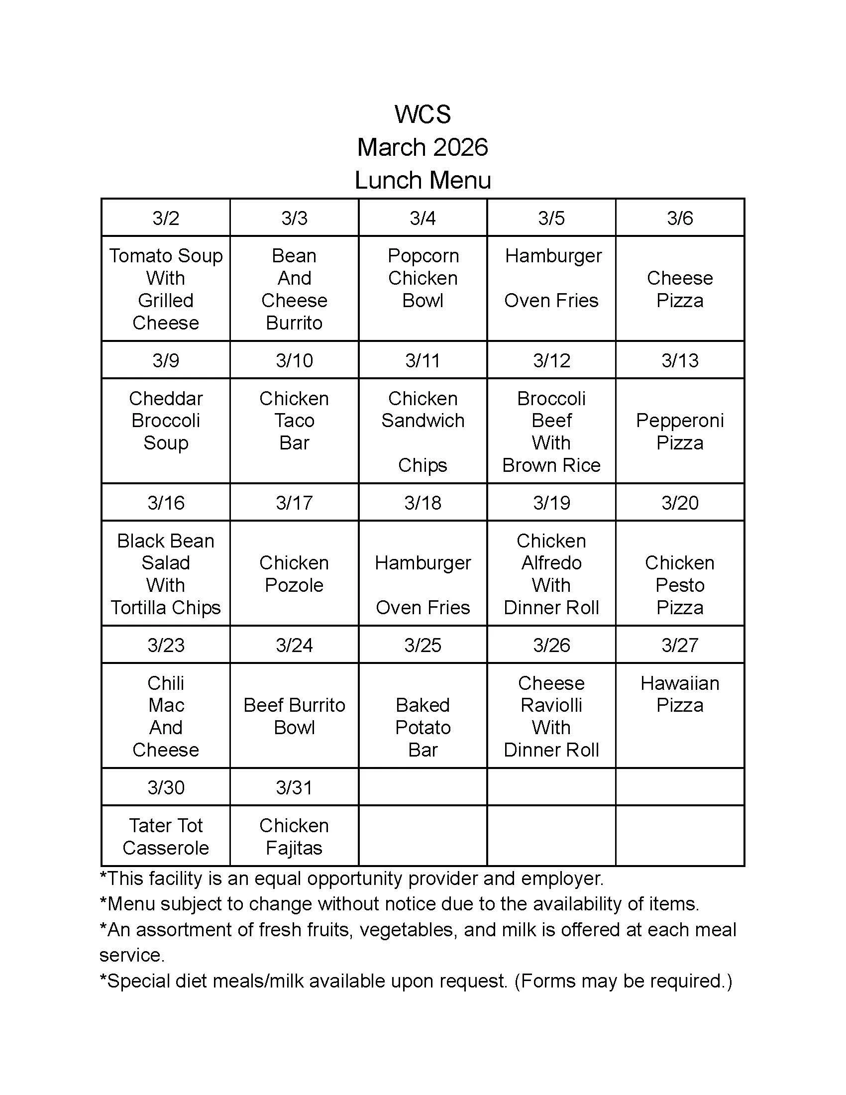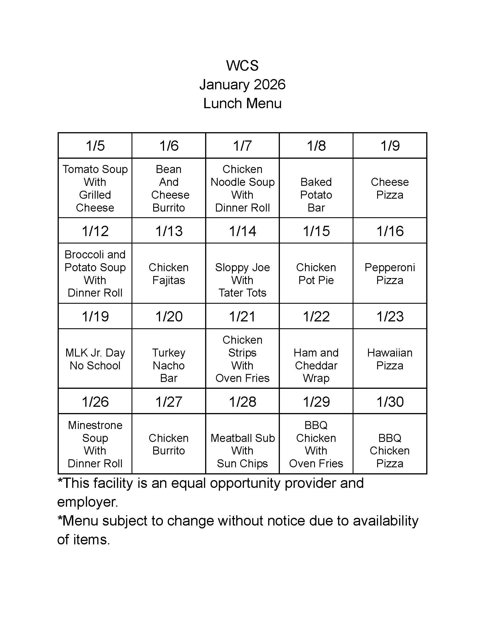 Menu subject to change without notice.